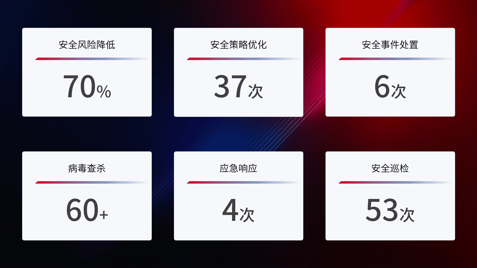 提供全面的安全事件报告体系,,,,包括处置报告、、、、周报、、、季度和年度总结,,,结合持续监控,,帮助客户深入了解网络安全状况。。。