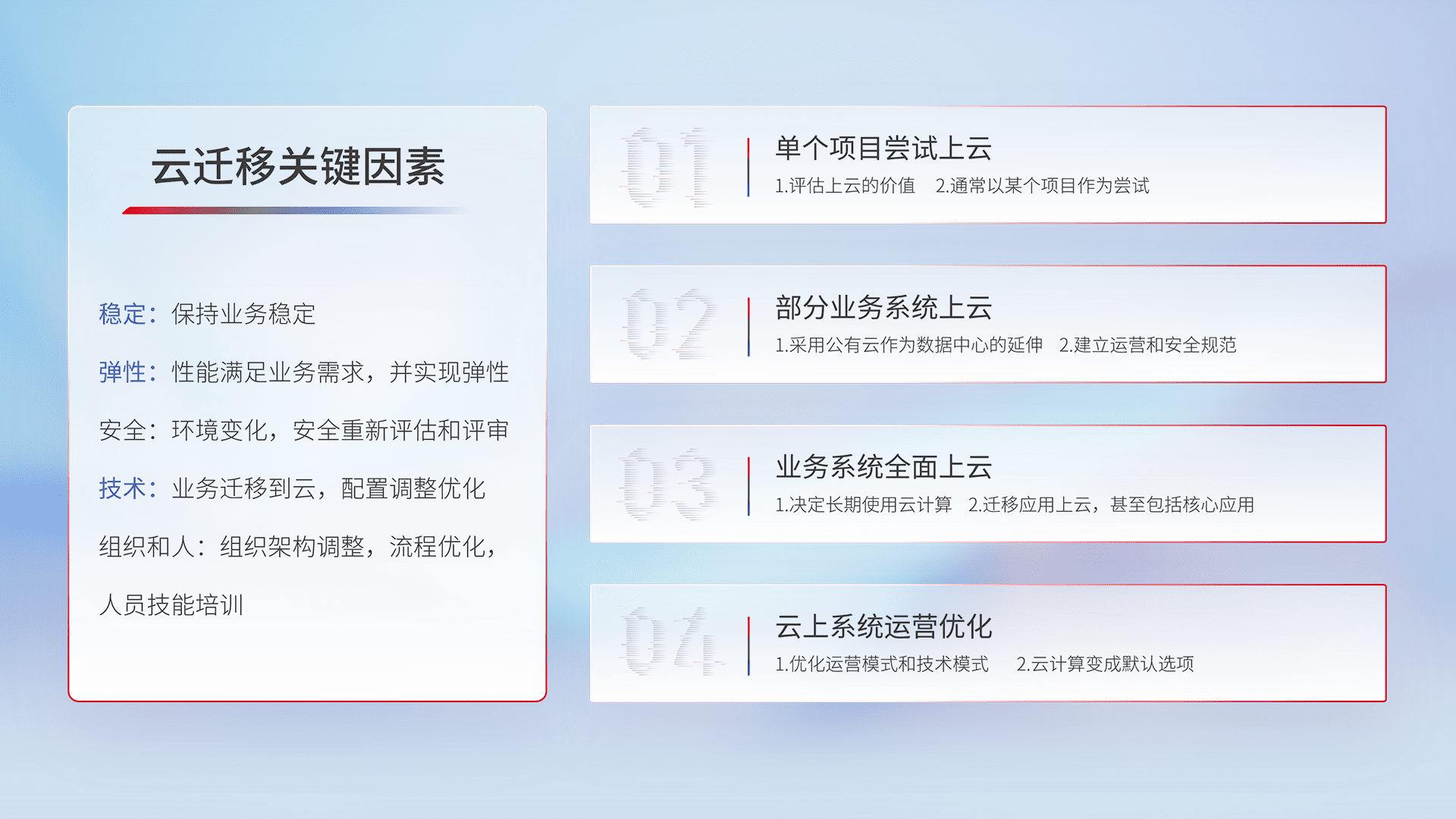 结合实际业务,,从规划设计、、、云平台选型、、、、云原生改造、、、数据迁移、、、、集成交付,,,,迁移全过程为客户识别最佳上云路径,,,做好风险识别管理,,设计网络架构、、、、身份权限、、、安全审计合规、、操作审计、、、日志审计、、、监控告警策略、、、多站点容灾设计等,,对云上基础设施进行整体规划,,,提升IT治理水平,,以满足弹性、、高可用、、高性能的需求。。