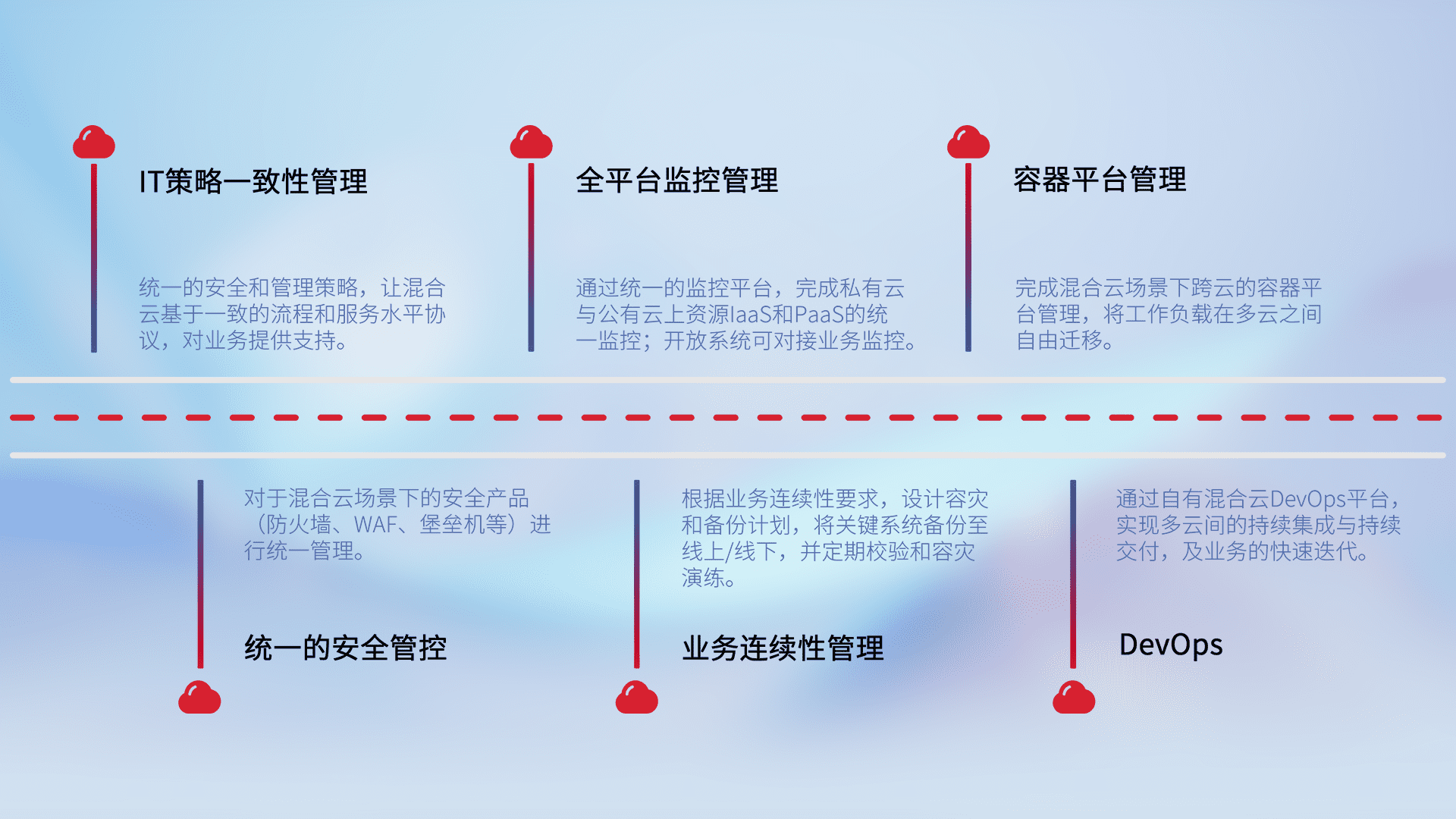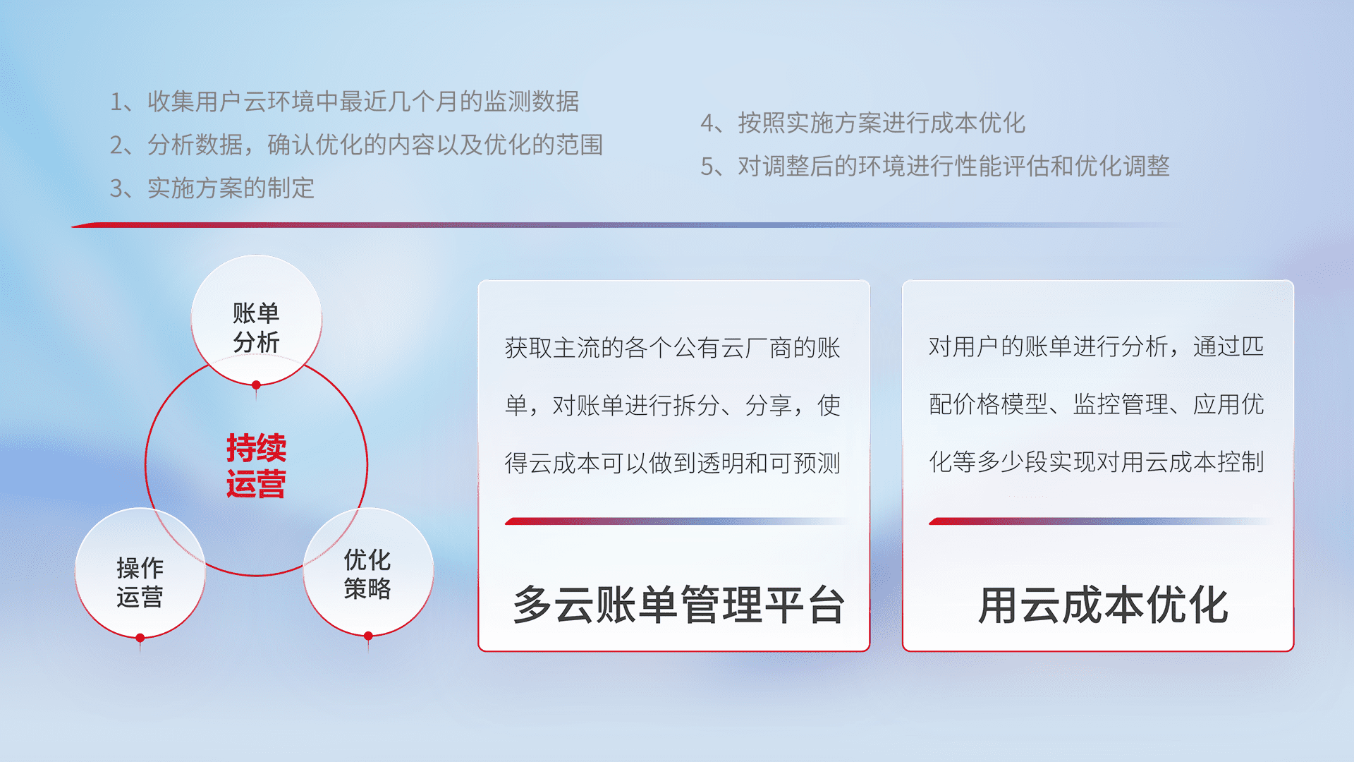 通过多云纳管,,,,以统一的资源数据模型把客户的云资源进行抽象和封装,,进而实现对多云资源的统一操作,,,保障云资源管理的可靠性、、、、稳定性与可用性。。。量身定制化运维内容,,,,配置、、、、开发运维、、、补丁管理、、备份、、、、监控、、、认证和访问管理、、、审计和日常巡检等,,,,保障在用云过程中的可靠度,,稳定度以及高可用率。。。